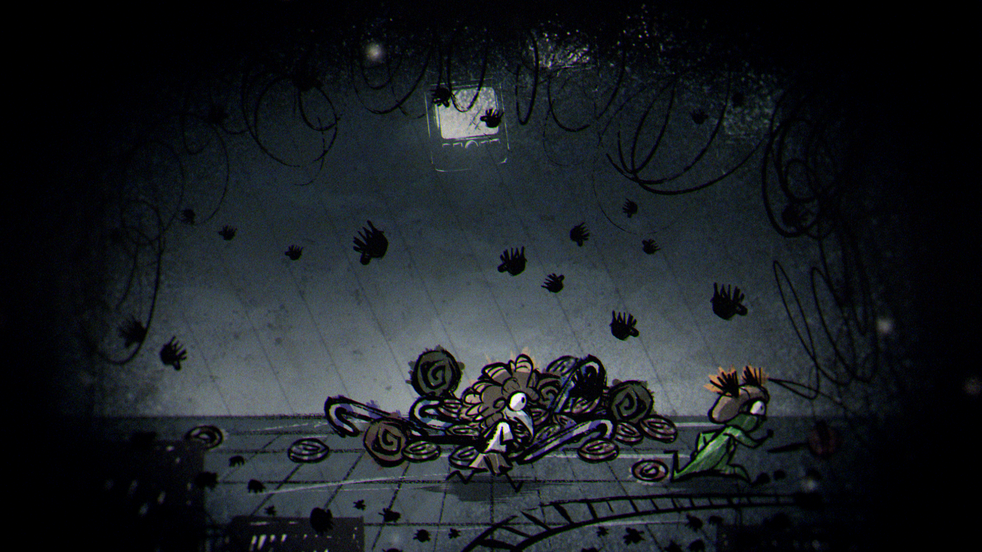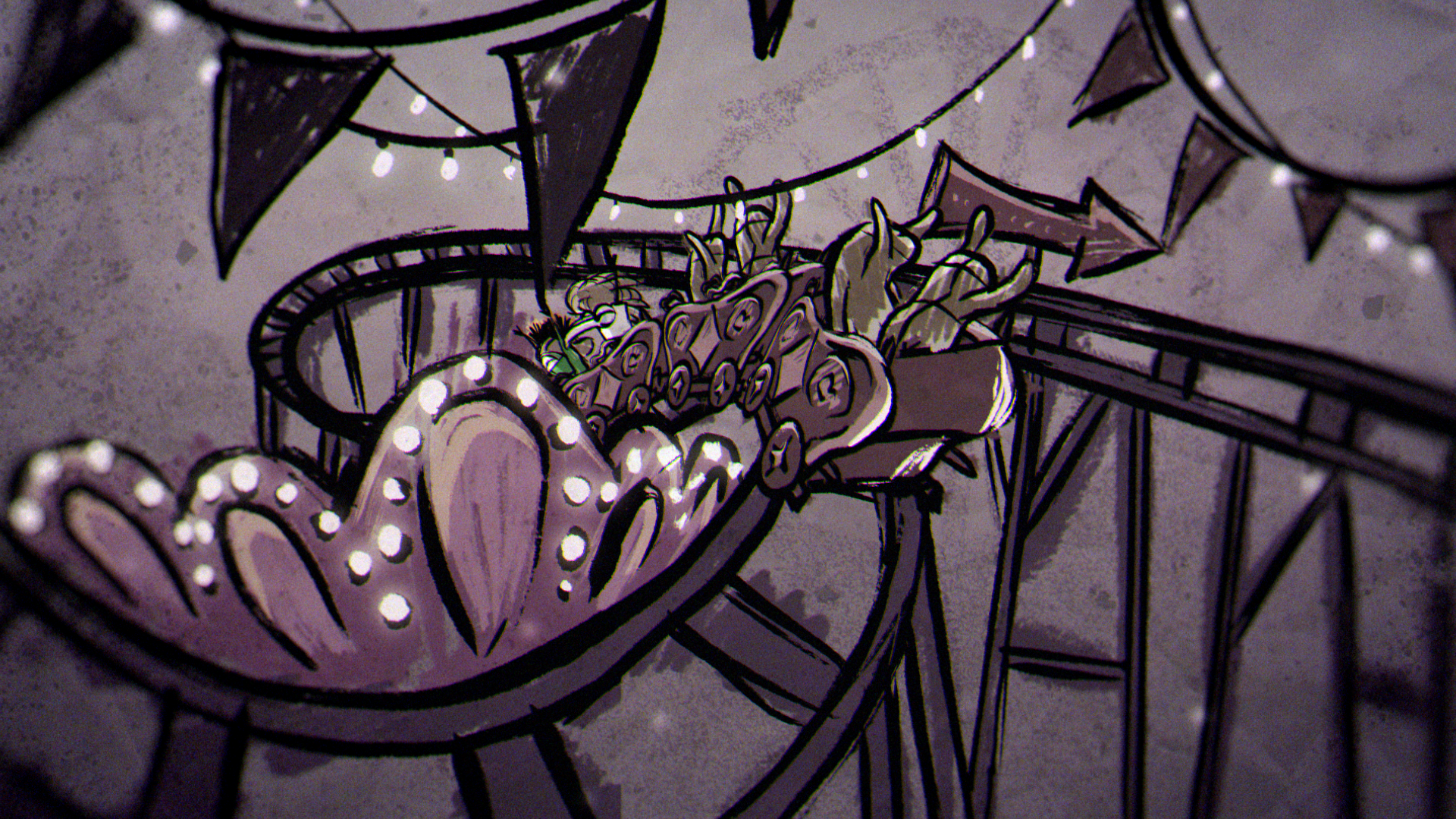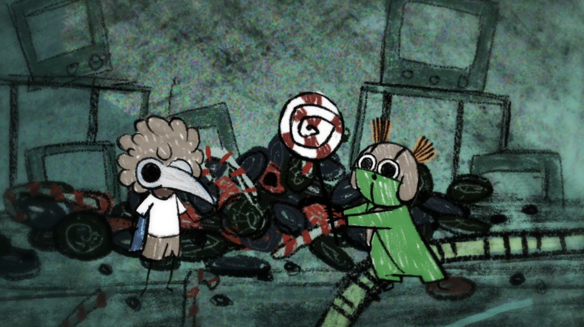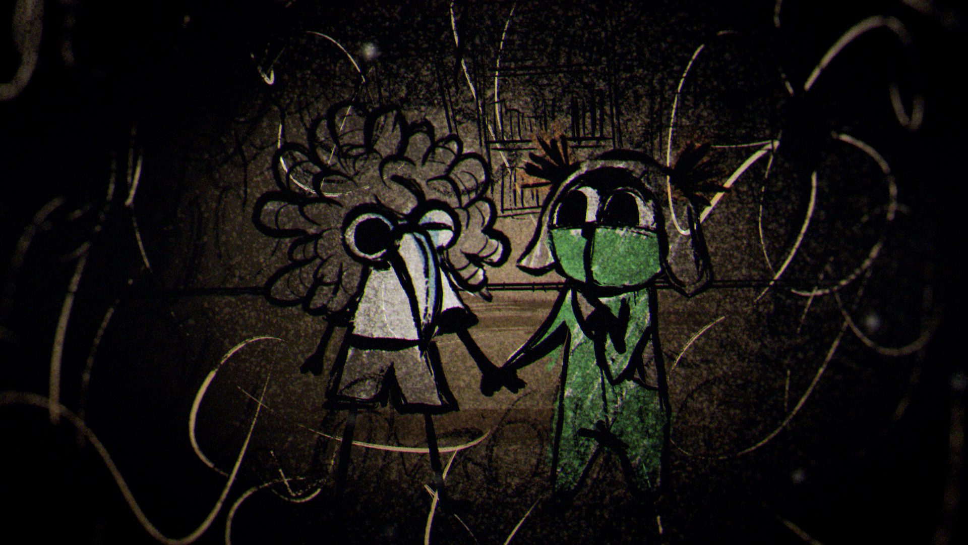 In a quiet moment from the game, a sheet of paper unfolds to show a rough drawing of Low and Alone, hand in hand and smiling. That small, heartfelt image set the tone for the entire piece, inspiring a striking 2D world built from crayon lines and bold, childlike marks. The narrative moves through four iconic locations from the game — the Carnivale, Candy Factory, Institute, and Necropolis — where the children encounter the Residents while fleeing the ever-creeping darkness.