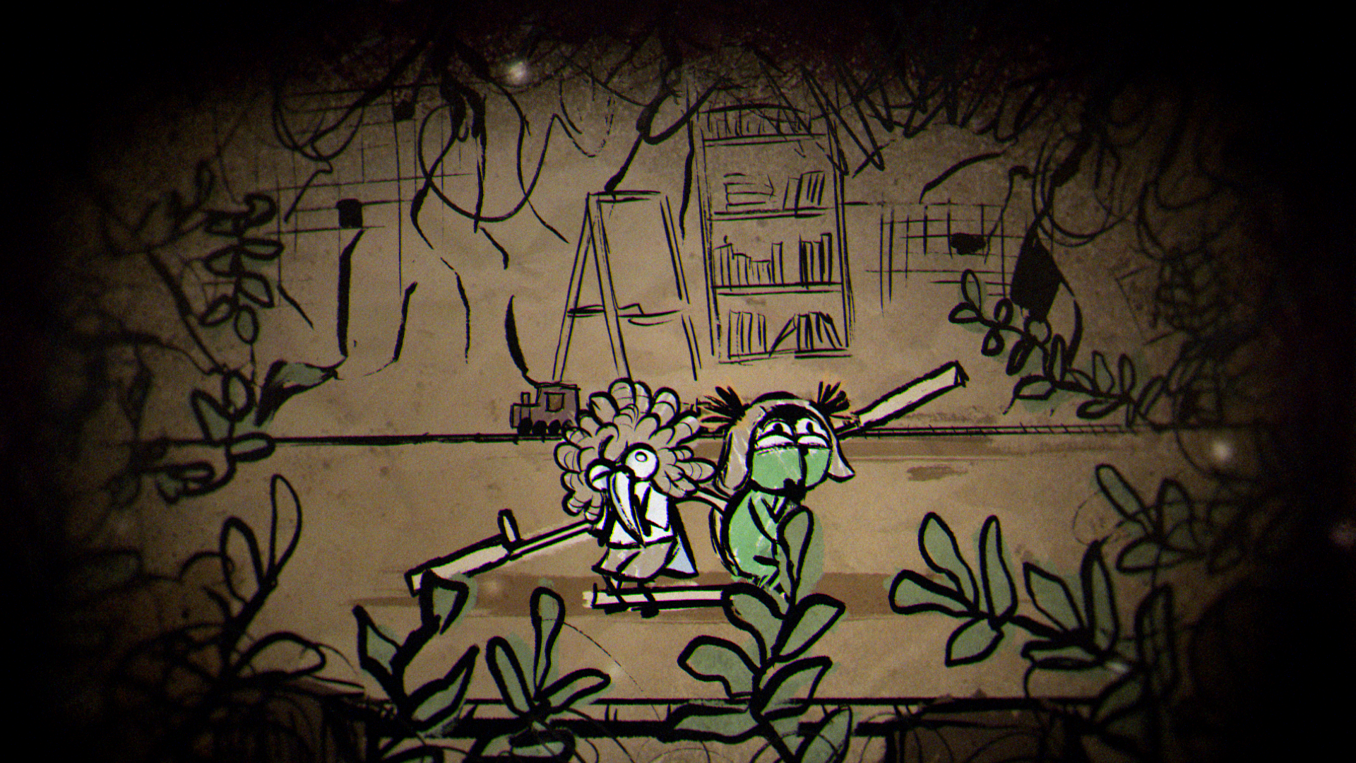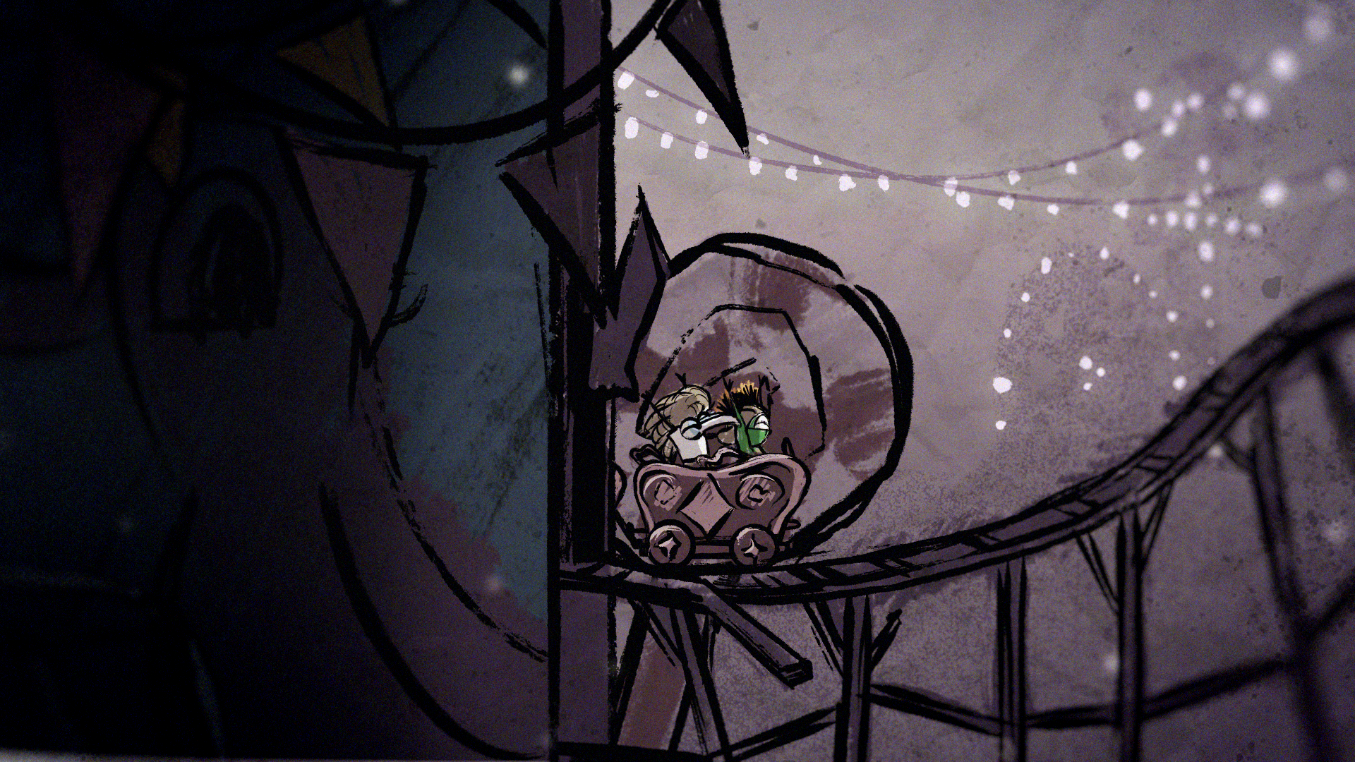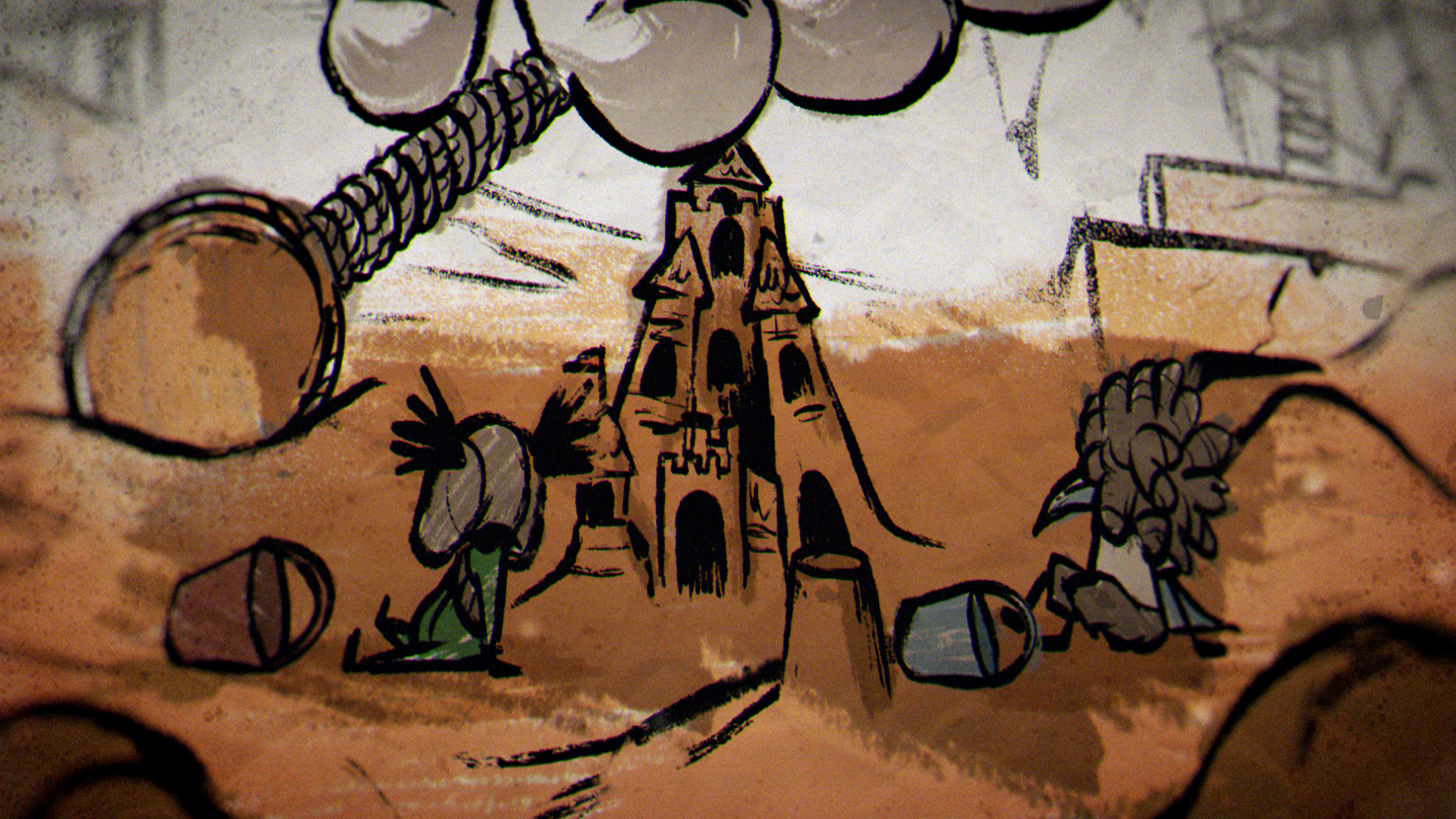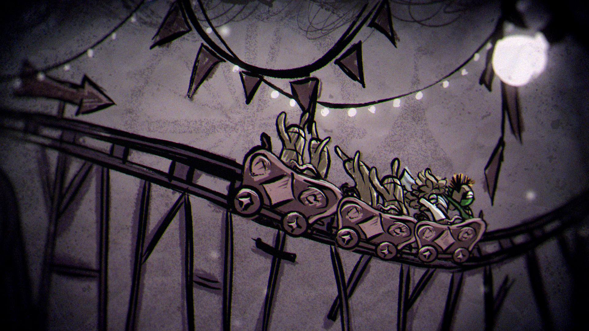 In a quiet moment from the game, a sheet of paper unfolds to show a rough drawing of Low and Alone, hand in hand and smiling. That small, heartfelt image set the tone for the entire piece, inspiring a striking 2D world built from crayon lines and bold, childlike marks. The narrative moves through four iconic locations from the game — the Carnivale, Candy Factory, Institute, and Necropolis — where the children encounter the Residents while fleeing the ever-creeping darkness.