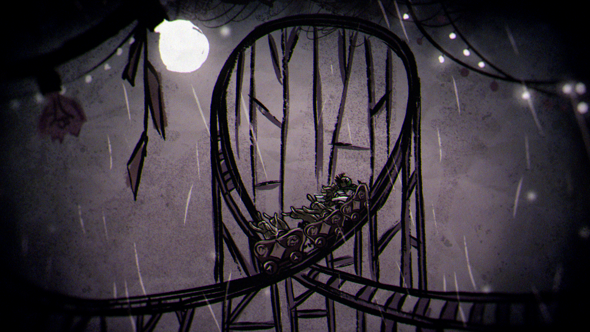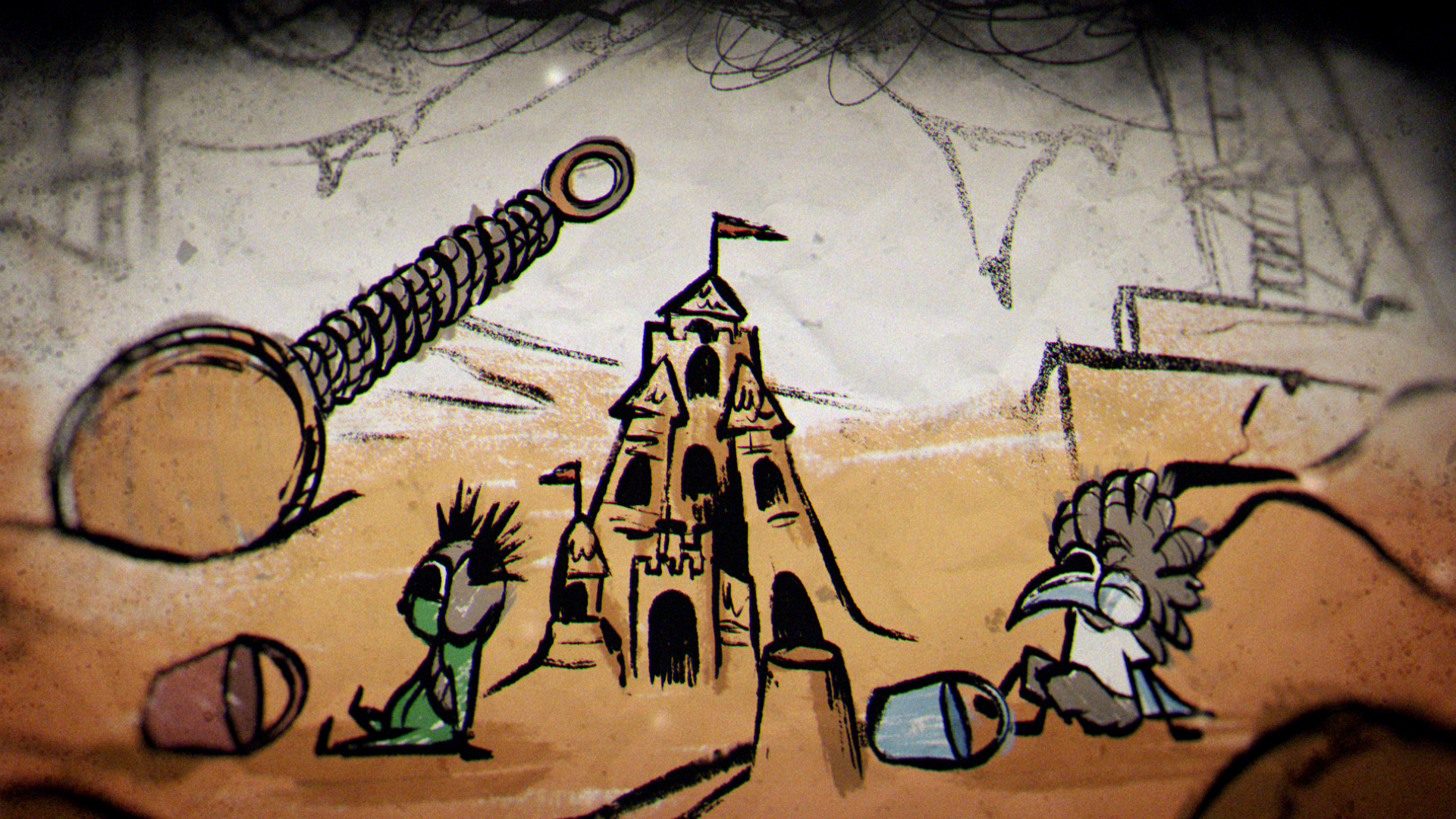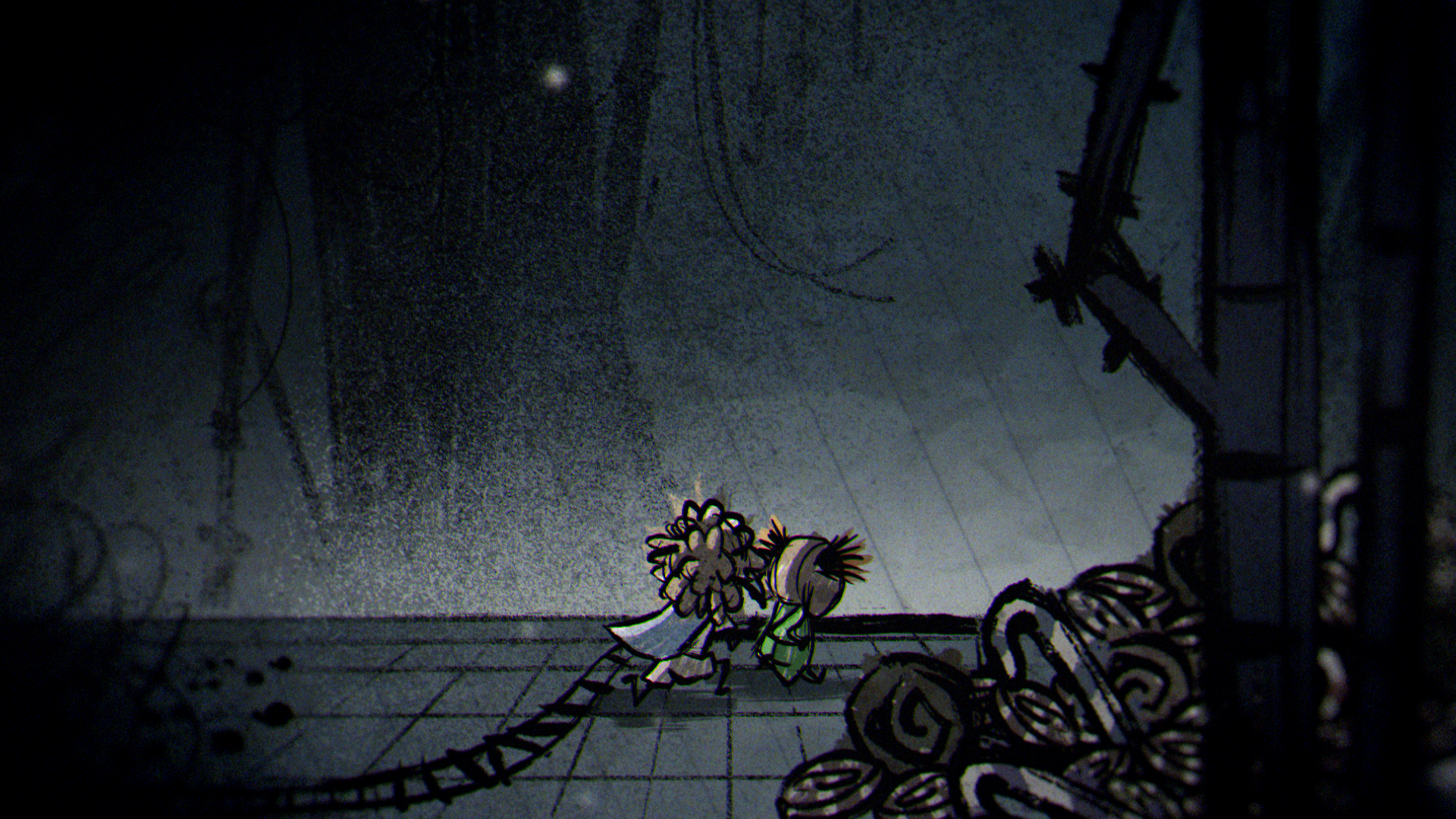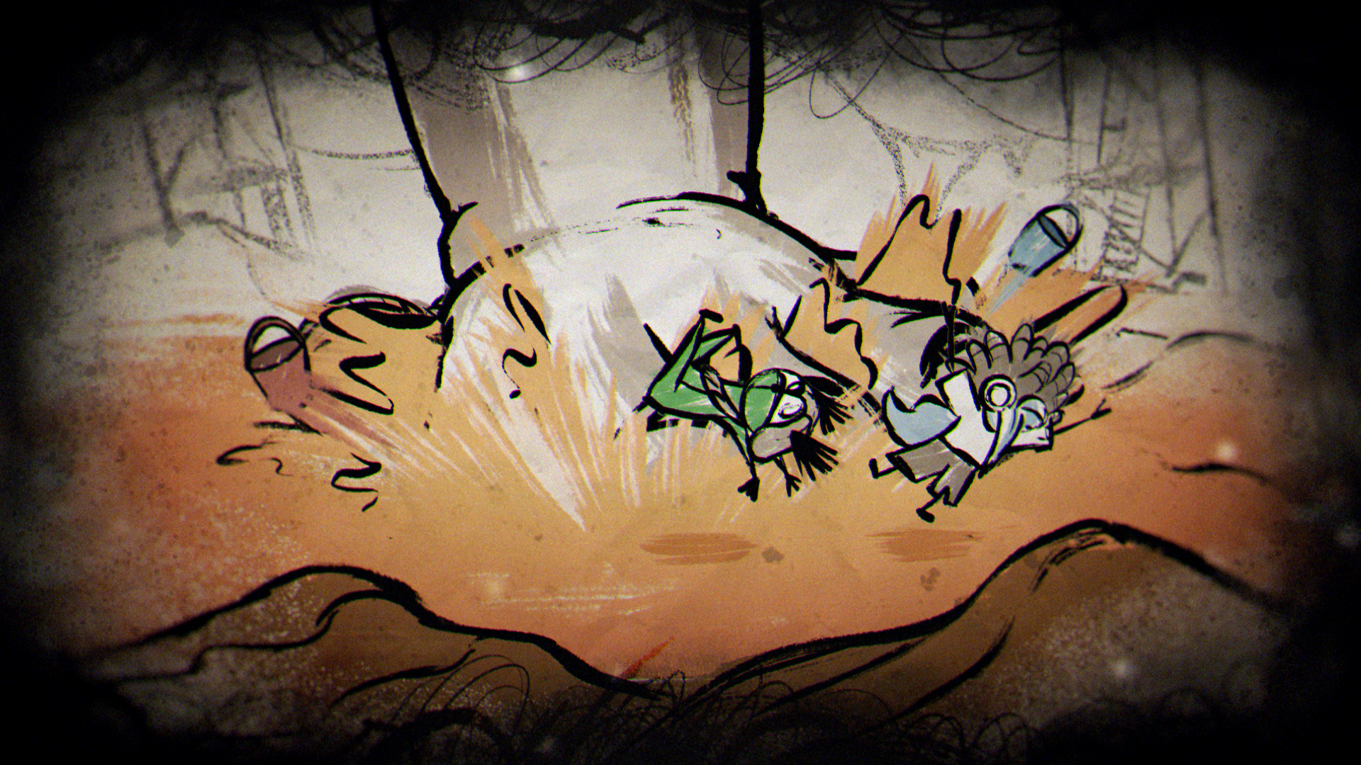 In a quiet moment from the game, a sheet of paper unfolds to show a rough drawing of Low and Alone, hand in hand and smiling. That small, heartfelt image set the tone for the entire piece, inspiring a striking 2D world built from crayon lines and bold, childlike marks. The narrative moves through four iconic locations from the game — the Carnivale, Candy Factory, Institute, and Necropolis — where the children encounter the Residents while fleeing the ever-creeping darkness.