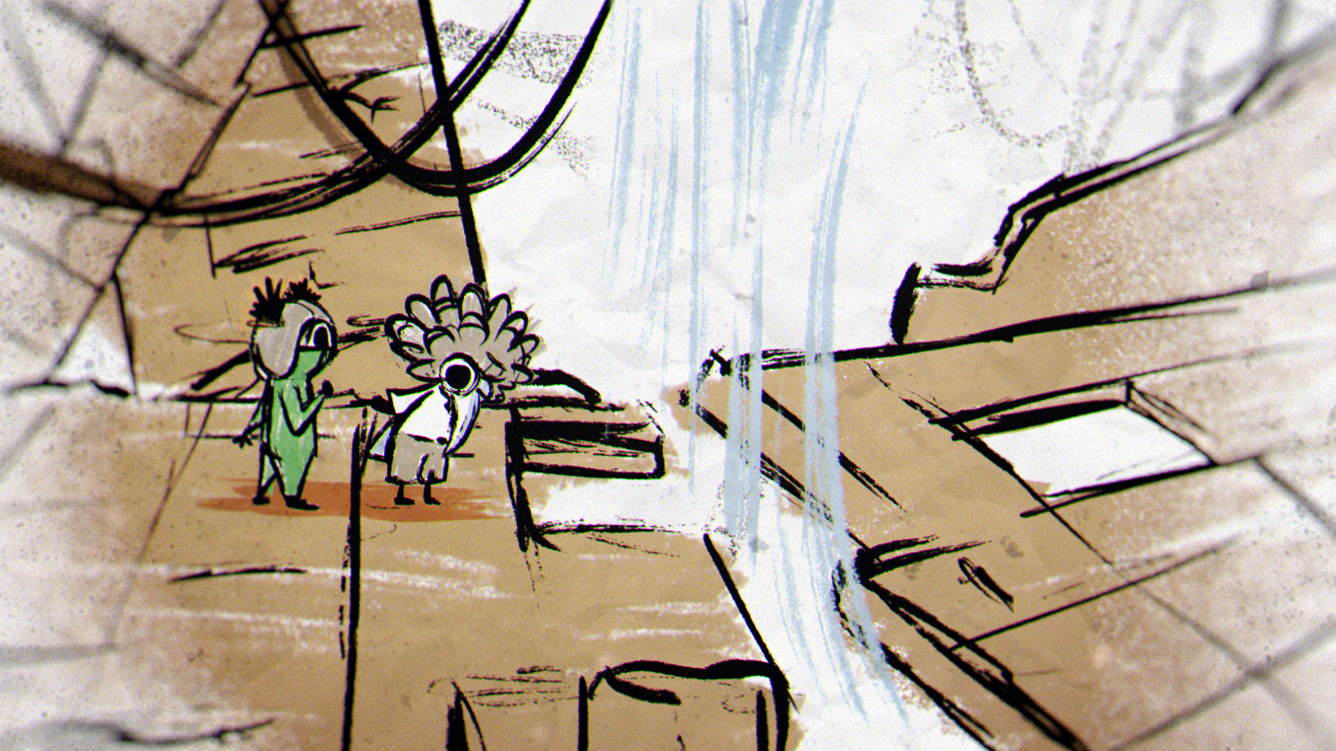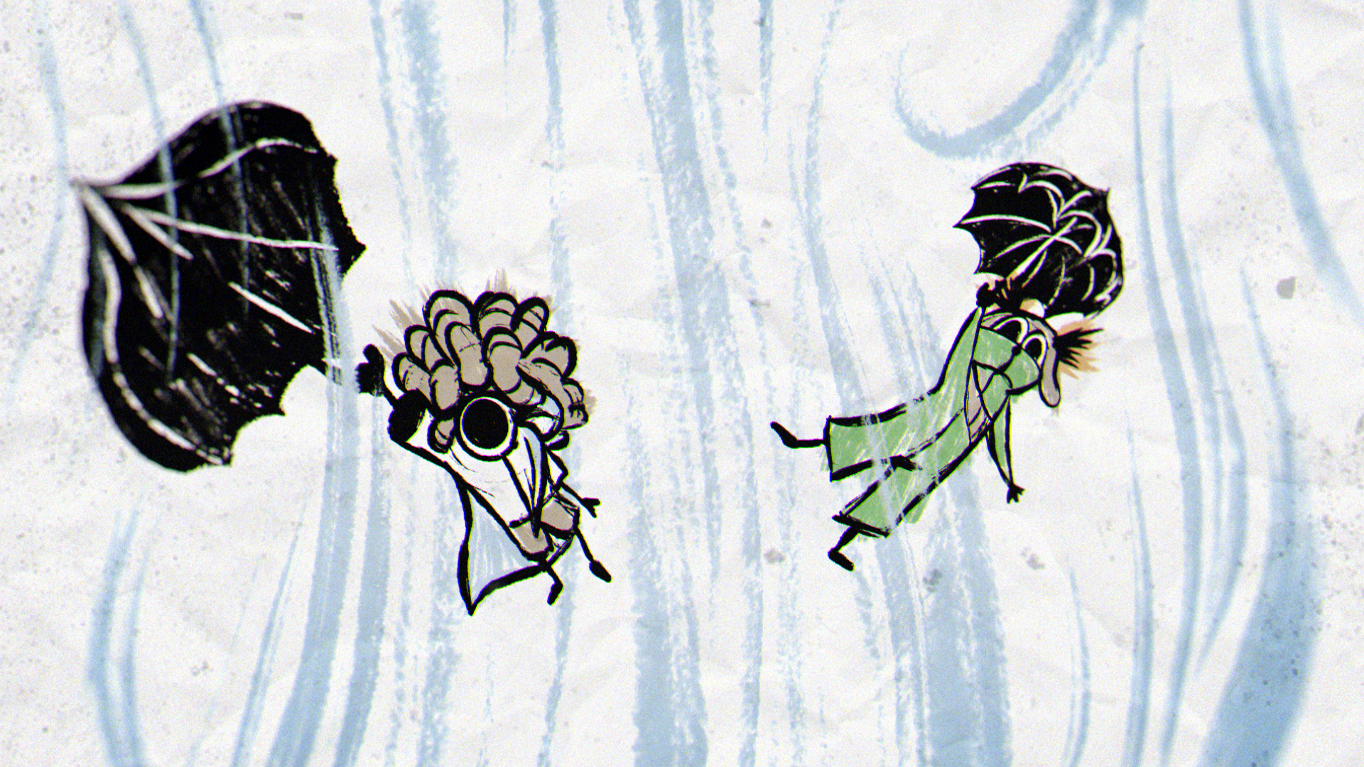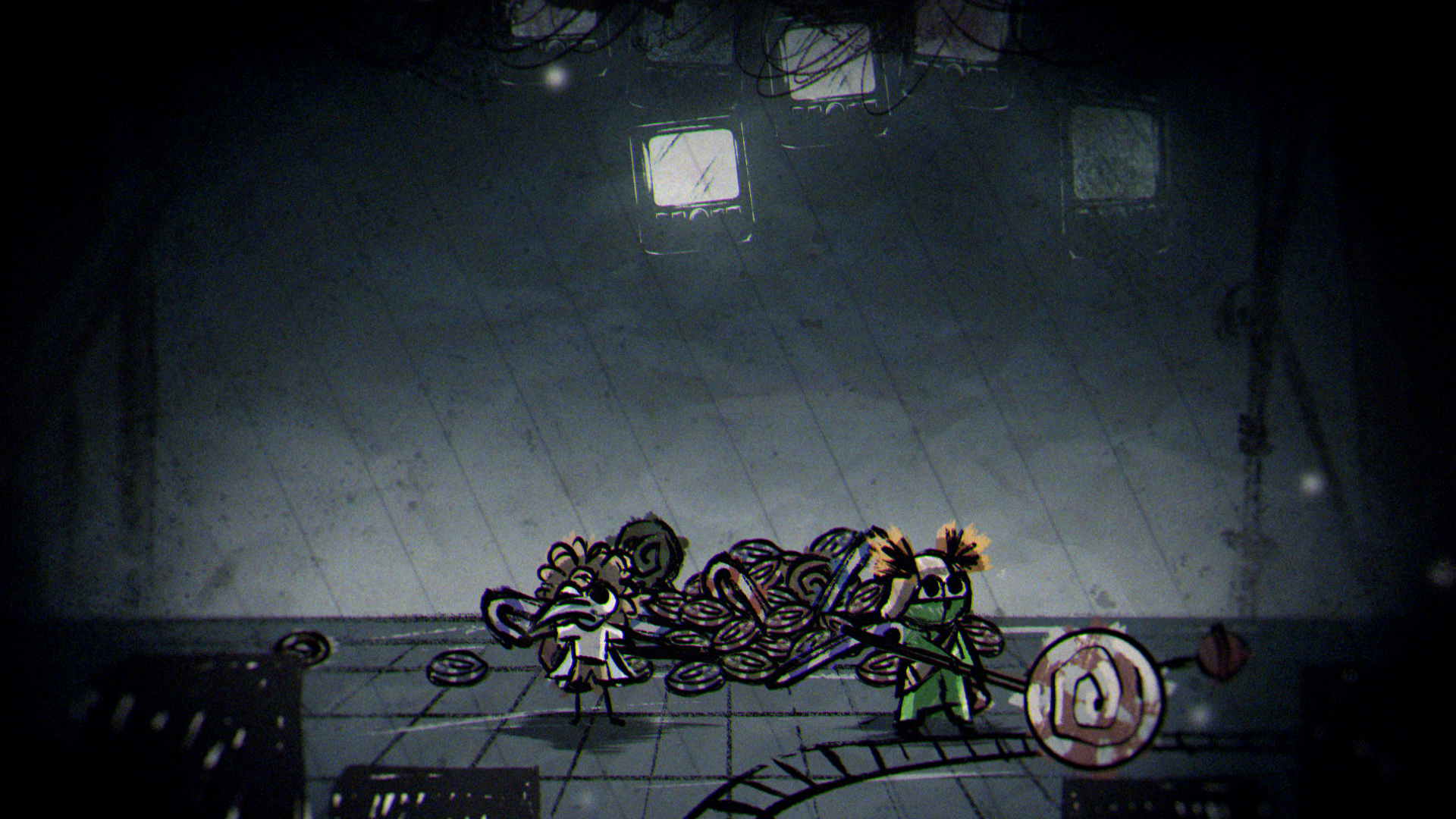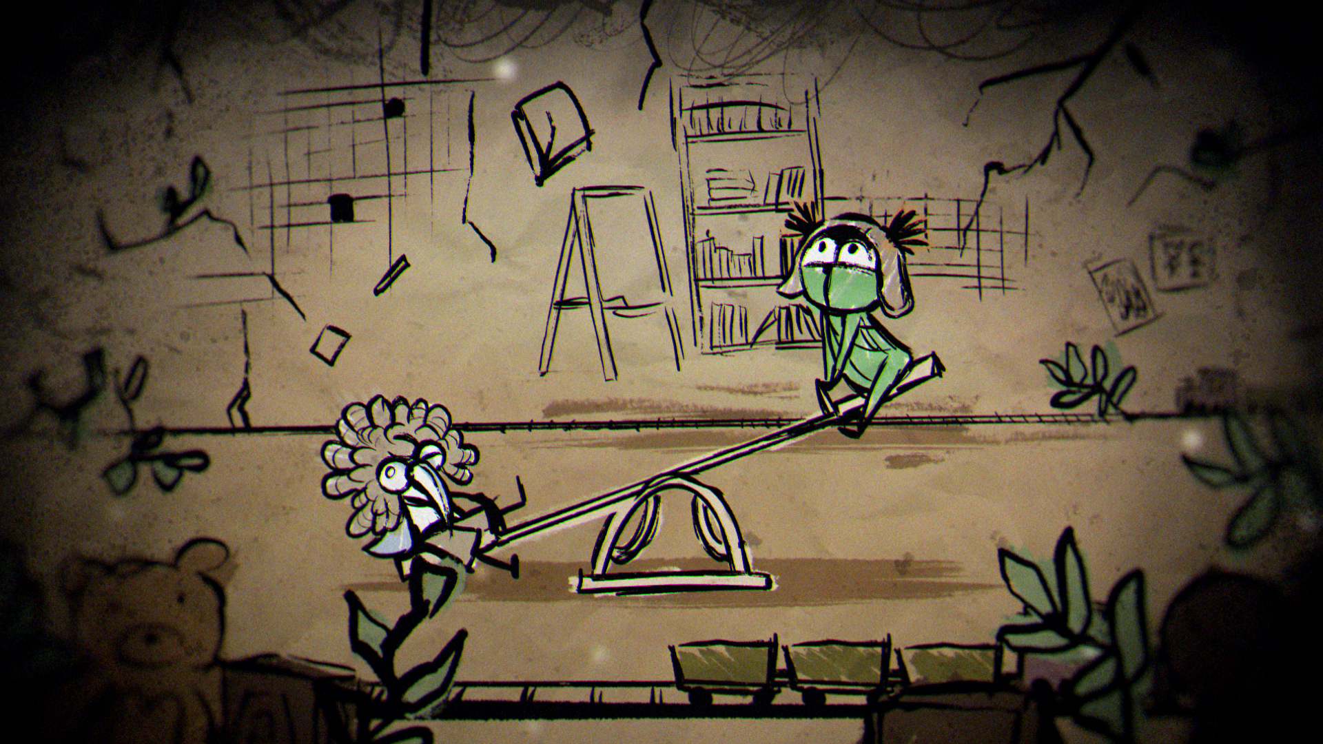 In a quiet moment from the game, a sheet of paper unfolds to show a rough drawing of Low and Alone, hand in hand and smiling. That small, heartfelt image set the tone for the entire piece, inspiring a striking 2D world built from crayon lines and bold, childlike marks. The narrative moves through four iconic locations from the game — the Carnivale, Candy Factory, Institute, and Necropolis — where the children encounter the Residents while fleeing the ever-creeping darkness.